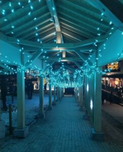 初めて、湯畑へ行く入口からライトアップされた遊歩道に入ると、青い光が星のように輝いていて、歩いているだけで気持ちが落ち着きました。