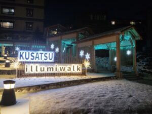 冬の冷たい夜の空気の中で、あたたかい温泉の湯気と光に包まれた草津の夜は、とても静かでロマンチックでした。