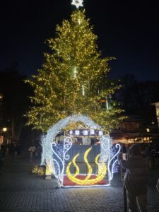 少し進むと、中央にライトアップされた大きなクリスマスツリーがあり、湯畑の中でもひときわ目立っていました。