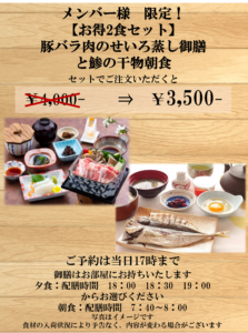 4月19日~6月29日まで【豚バラ肉のせいろ蒸し御膳】+【鯵の干物朝食】
