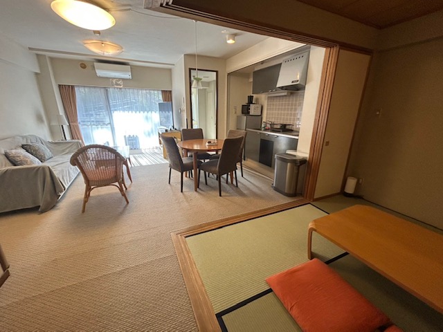 8畳の和室二間に、リビングとキッチンのついた部屋タイプです。