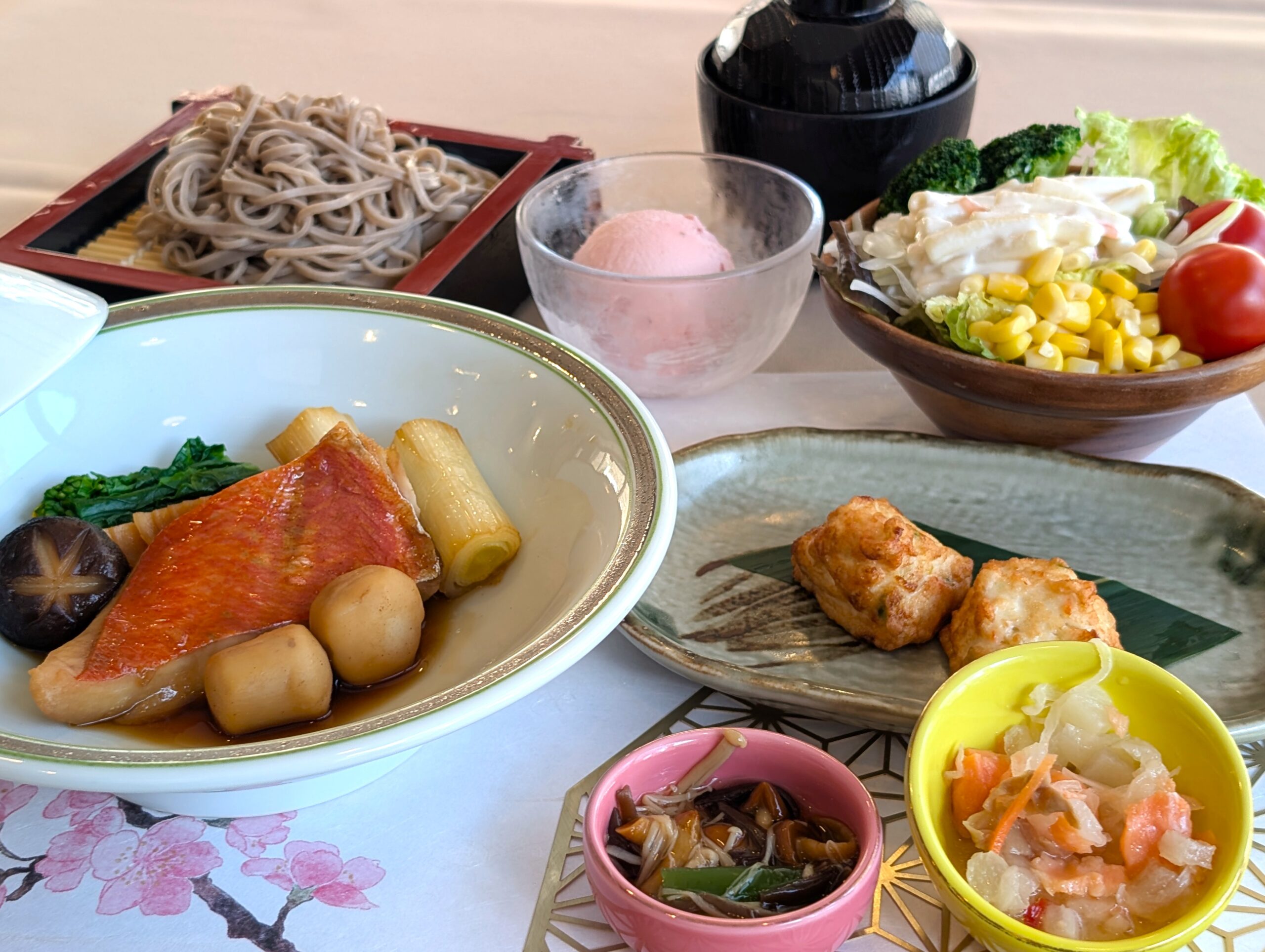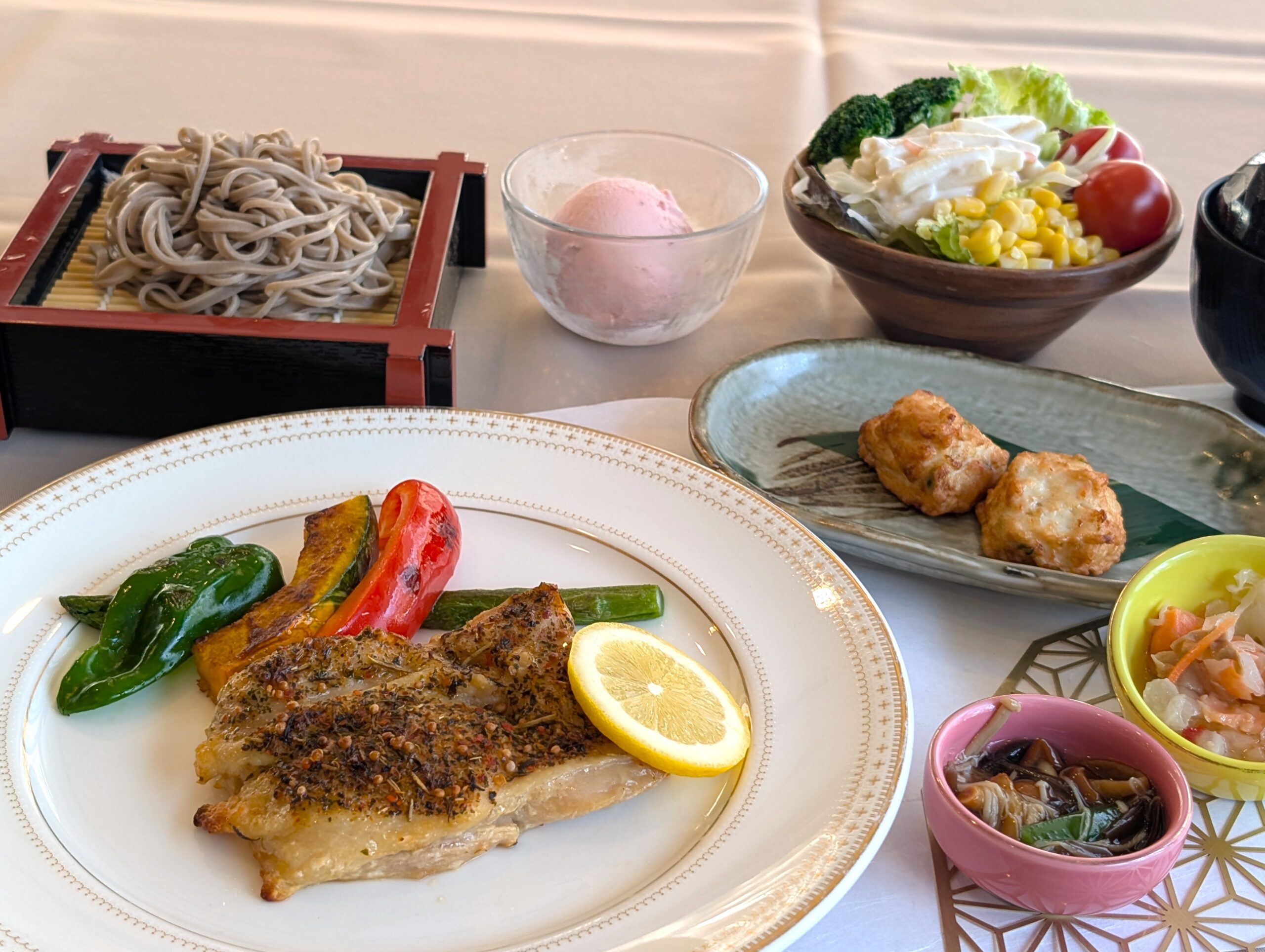 蓼科のご夕食は¥2.500 サラダビュッフェ(8種類サラダと信州そば、鶏のから揚げ、カレーソース、ピザ、ご飯、エビピラフ、みそ汁、デザート付き)¥3.980または¥5.250メインメニューにサラダビュッフェセットで付いているお得なコース料理です。