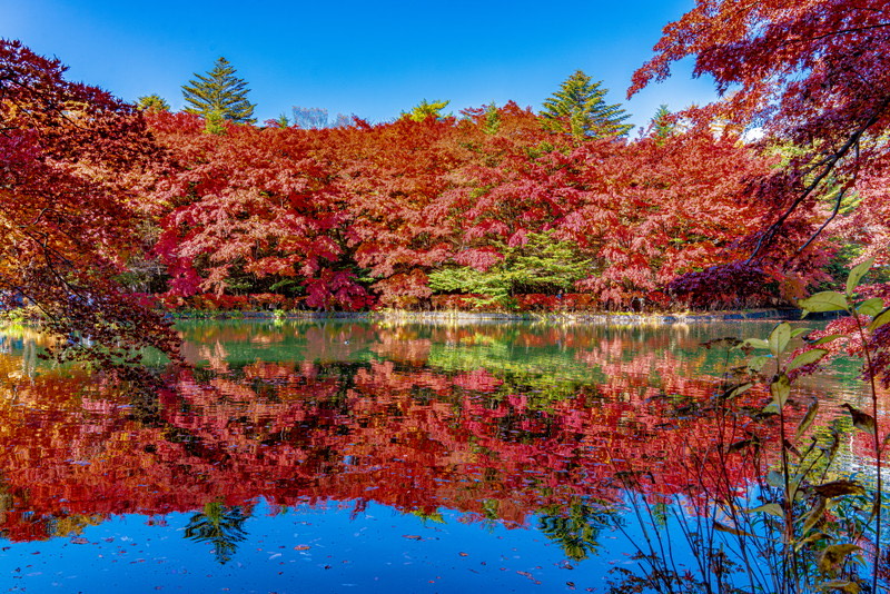 池の周囲にはモミジやカエデなどの木々が並び、赤や黄色に色づいた葉が水面に映り込む様子はまさに絶景です。
