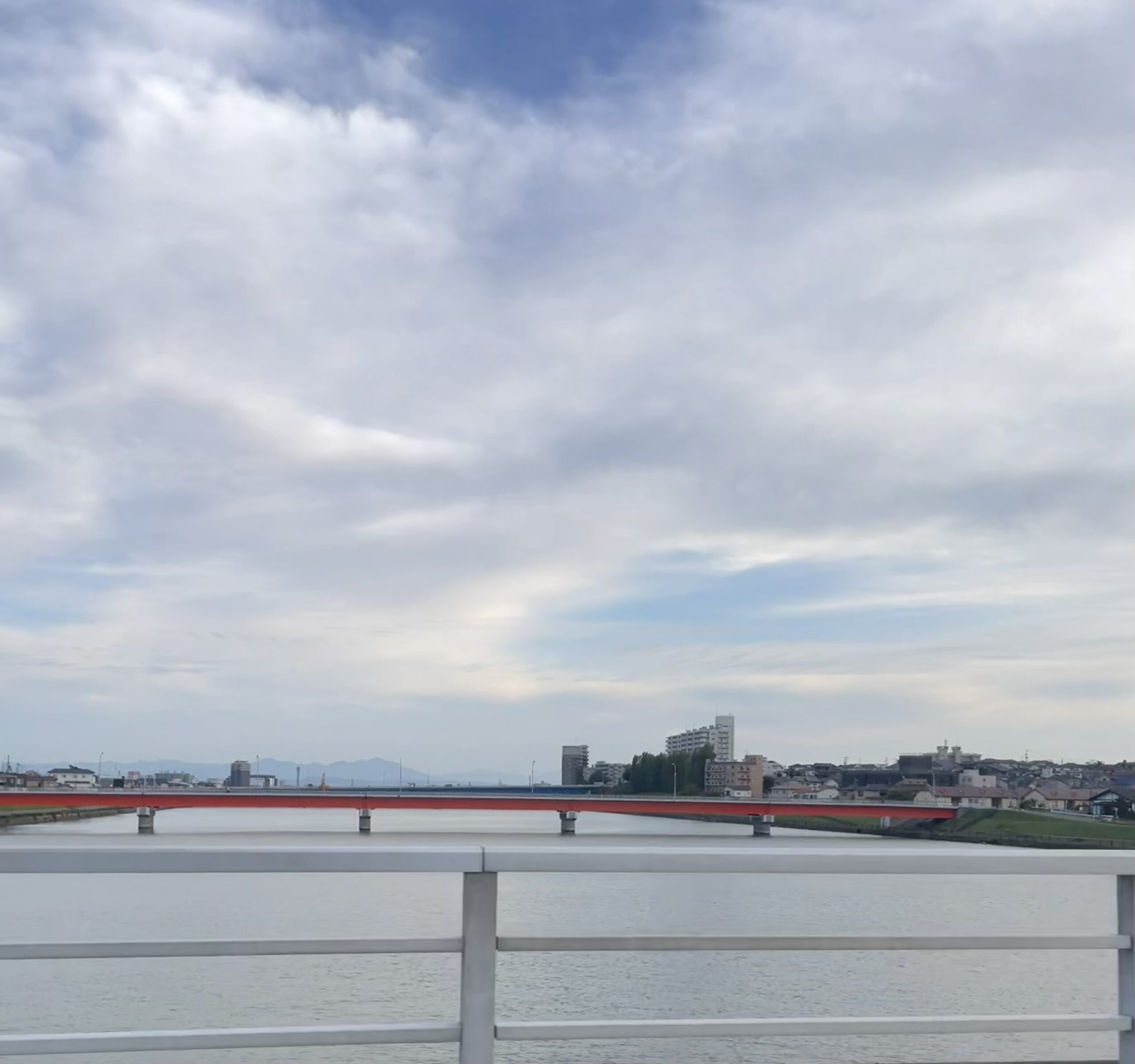 列車が走り出すと同時に、山々が遠ざかり、視界には大きな空と川が広がりました。